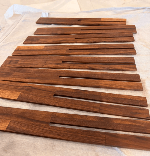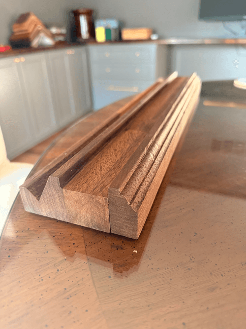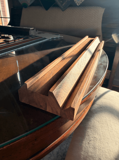 I searched all over to find a substantial, rich, real walnut rack that would accommodate a host of my tiles (not to mention pushers that did more than tag along). Turns out the answer was in my garage. These are show stoppers, and I am here for it! Their heft and silhouette don't just show off your tiles, they SHOW UP. Their pushers stand alone- requiring no hinging or magnets, and the view from the ends shows how their finishing details complete the entire profile of symmetry. These are unique and high quality- they do not look like anything else out there. They are not a cheaper wood stained "walnut".